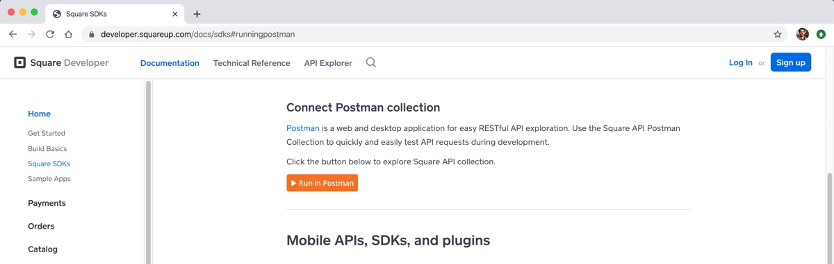 Postman offers a nifty little button that you can embed into your API documentation page. Above is a screenshot of it on Square’s API page. Just click the “Run with Postman” button and Postman launches where you can start playing with Square’s API.